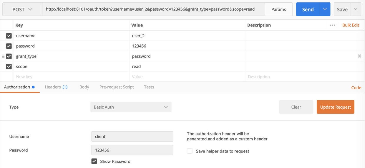 代码中配置了一个 client,id 是 client,密码 123456。 authorizedGrantTypes 有 password 和refresh_token 两种方式。