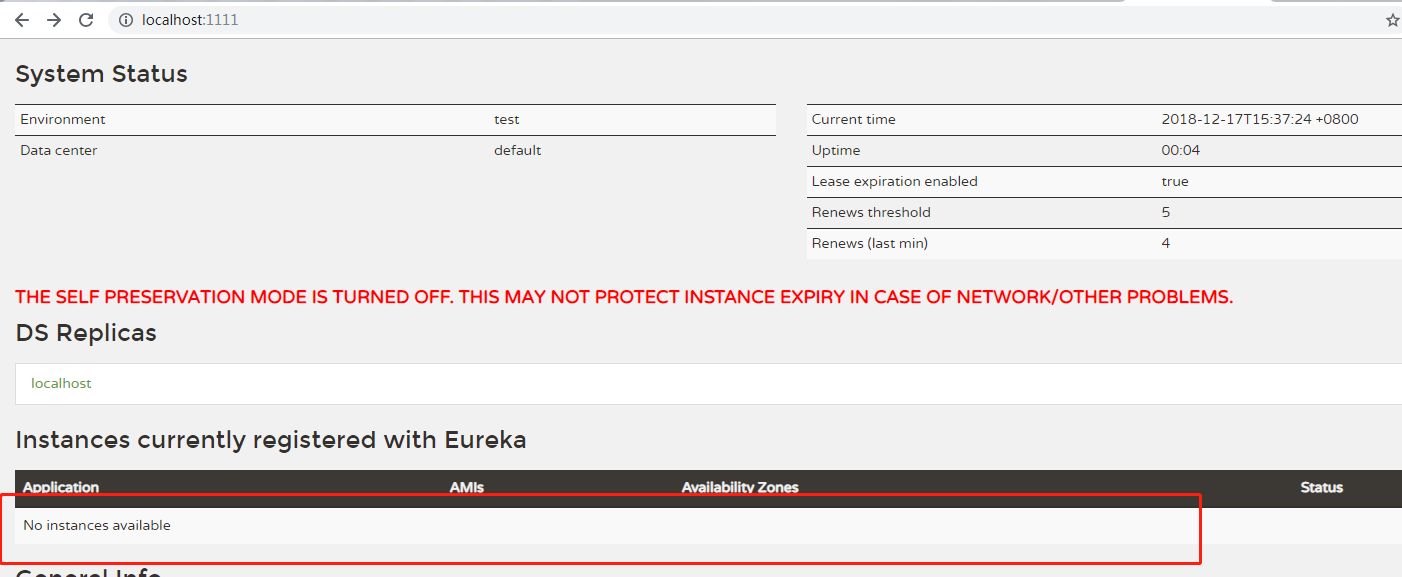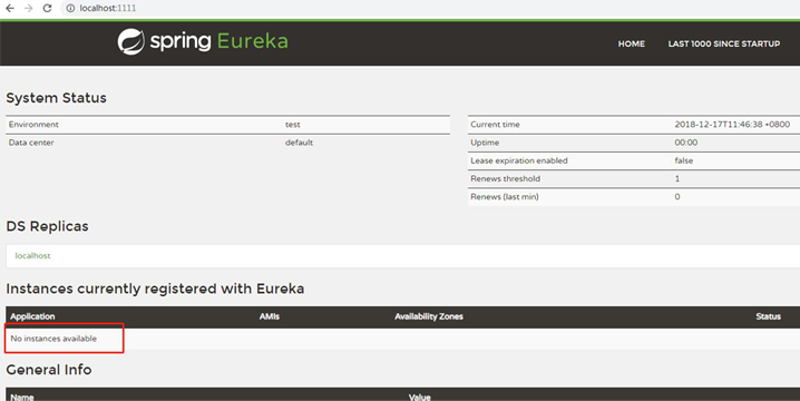 启动应用,访问 http://localhost:1111/,注册中心启动成功,此时有0个服务