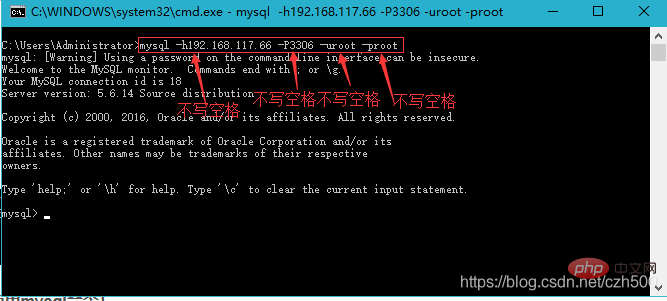 如果大家怕会忘记小p和密码之间一定不能有空格这句话,那就全部统一写成所有的参数都不要加空格,这样写就不太容易出错了,统一写成mysql -h192.168.117.66 -P3306 -uroot -proot就ok了,如下图: