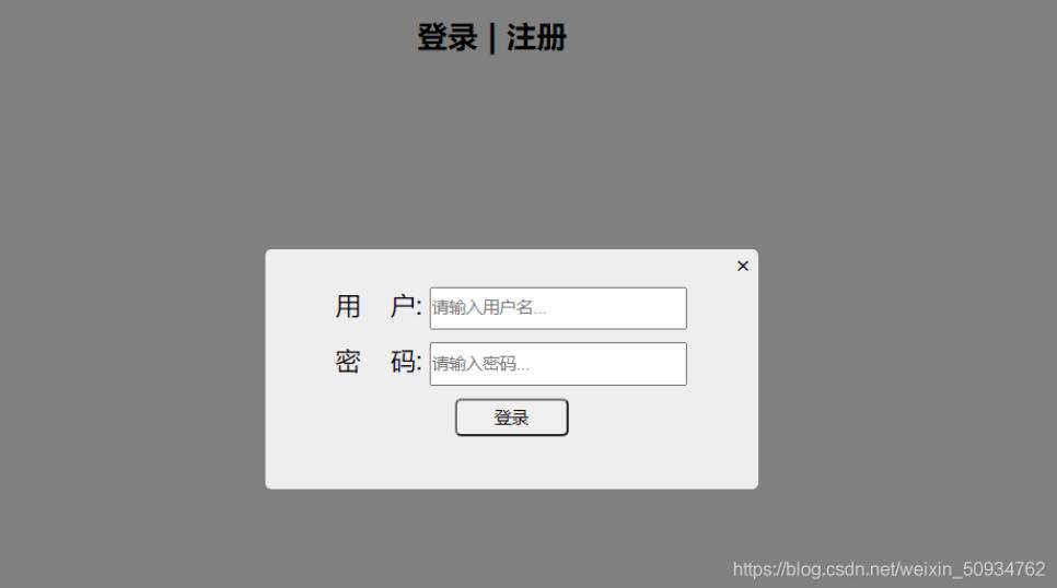 <div id="app"> <!--登陆按钮--> <h3 id="login" v-if="isLogin==true">欢迎您 | <a href="javascript:;" @click="logout">注销</a></h3> <h3 id="login" v-else><a href="javascript:;" @click="login1">登录</a> | 注册</h3> <!--登陆框 --> <div id="login-box" :style="log==0?'display:none':'display:block;zIndex:1'"> <form action=""> <label>用 户: <input v-model="uname" type="text" placeholder="请输入用户名..."> </label> <label>密 码: <input v-model="upwd" type="password" placeholder="请输入密码..."> </label> <button type="button" @click="login2">登录</button> <p id="close" @click="close">×</p> </form> </div> <!--背景半透明处理--> <div id="back" :style="log==0?'display:none':'display:block'"></div> </div>