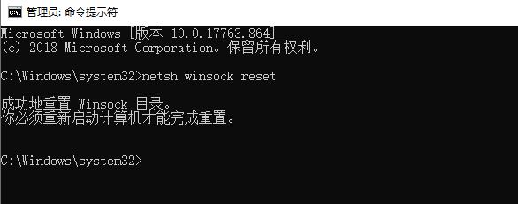 2.在打开的窗口中输入"netsh winsock reset"后按下回车;