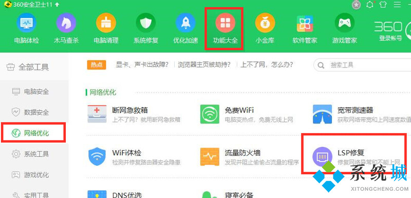 2.打开360安全卫士点击功能大全左侧的网络优化,选择LSP修复进入;