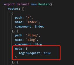 1、在路由器router下的 index.js 的配置中,给需要拦截登录的页面的路由上加一个meta: {loginRequest: true} ,其中loginRequest 变量自己可以随意定义
