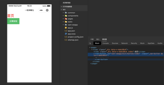 这样组件就成功引入了,而且也可以看到刚才那个拷贝目录的配置也生效了,可以看到vant-weapp目录已在wx里生成。