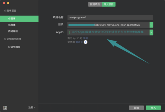 目录就是刚才说的那个在one_hour_app项目中npm run dev之后生成的dist下的wx。AppID的获取,需要先在微信公众平台注册,然后打开开发-开发设置找到。