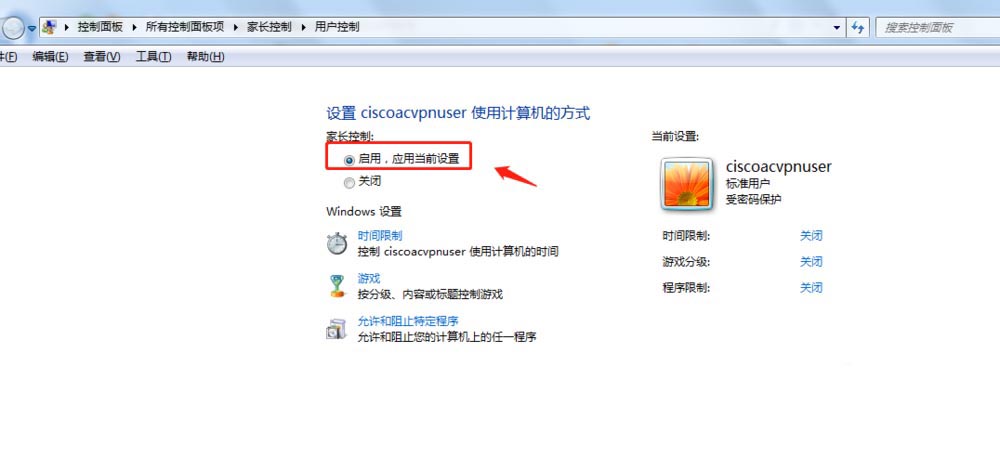 1、在用户控制中选择“启用,应用当前设置”,开启控制功能。