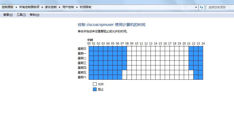 2、在用户控制中选择时间控制,勾选阻止用户使用电脑的时间。