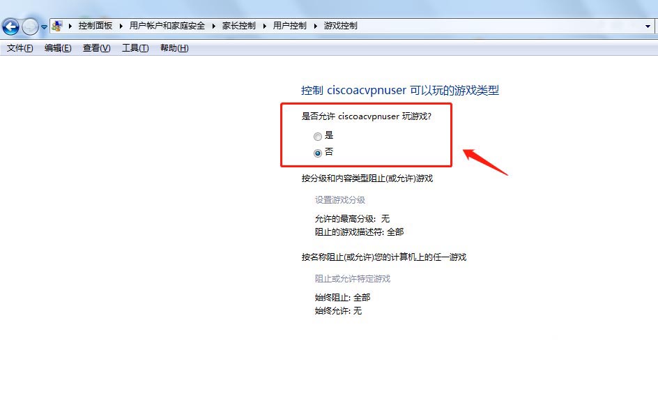3、在用户控制中选择游戏控制,在是否允许用户玩游戏的选项中选择否。重启电脑即可生效。