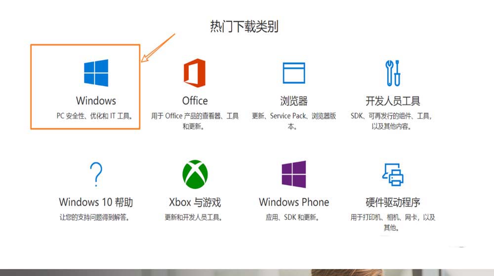 3、进入微软官网后,点击【Windows】。