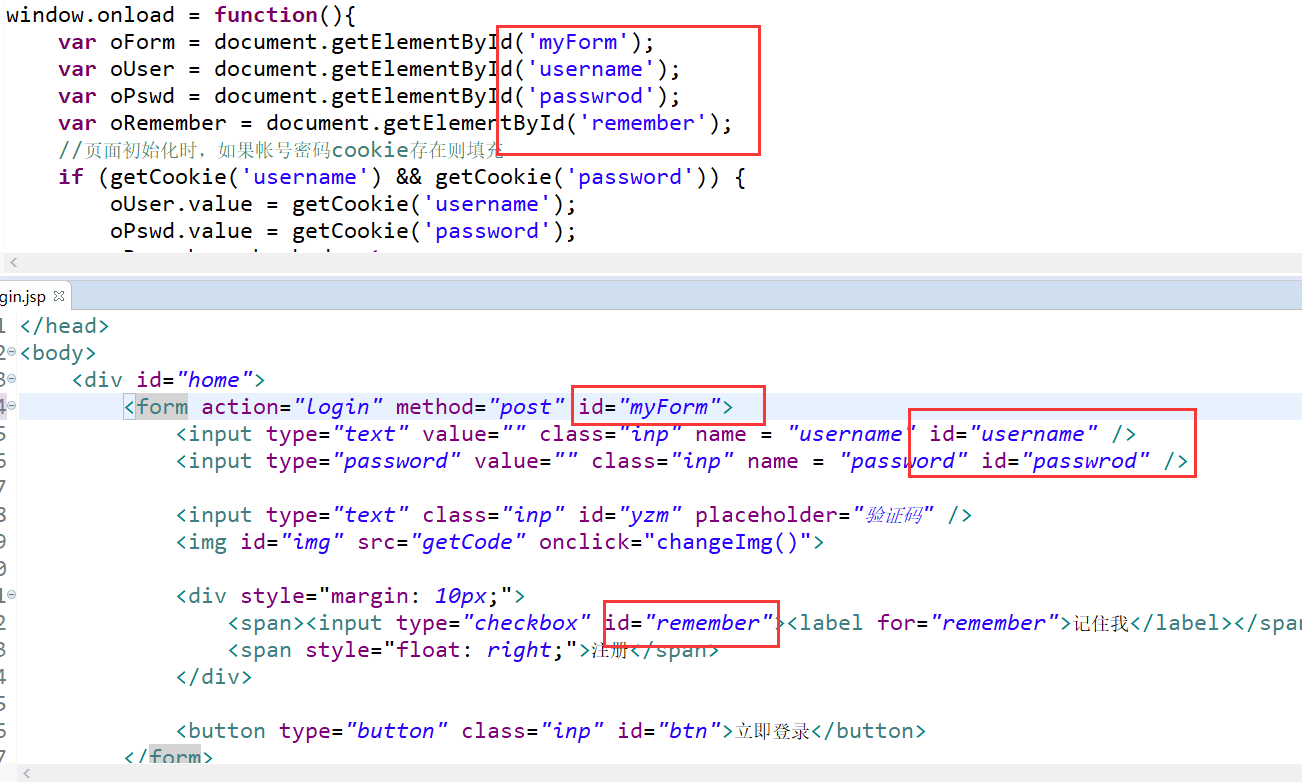 <form id="myForm" action="login" method="post"> <input type="text" value="" class="inp" name = "username" id="username" /> <input type="password" value="" class="inp" name = "password" id="passwrod" /> <input type="text" class="inp" id="yzm" placeholder="验证码" /> <img id="img" src="getCode" onclick="changeImg()"> <div style="margin: 10px;"> <span><input type="checkbox" id="remember"><label for="remember">记住我</label></span> <span style="float: right;">注册</span> </div> <button type="button" class="inp" id="btn">立即登录</button> </form>