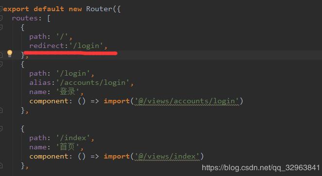 如下所示: export default new Router({ routes: [ { path: '/', redirect:'/login', }, { path: '/login', alias:'/accounts/login', name: '登录', component: () = import('@/views/accounts/login') } ]`` 嗯 就这样写就可以啦 我向来都