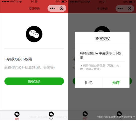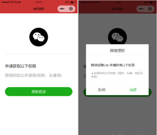 自己写一个微信授权登录页面让用户实现点击的功能,也就是实现了通过 button 组件去触发 getUserInof 接口。在用户进入微信小程序的时候,判断用户是否授权了,如果没有授权的话就显示授权页面,让用户去执行授权的操作。如果已经授权了,则直接跳过这个页面,进入首页。