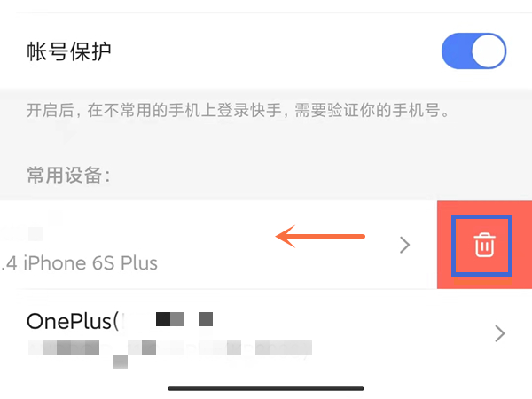 1、打开快手app,点击左上角三横线,再点击设置。 2、在设置中点击账号与安全。 3、在常用设备选项下选择需要删除的设备,向左滑动,点击删除的图标即可。 本文以红米K40为例适用