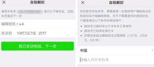 发送完成后我们返回微信,然后点击「我已发送短信,下一步」,当页面跳转后我们需要输入一个好友的电话号码,但如果对方不是你的好友,那么该号码要满足以下三个条件即可:1、注册时长超过半年;2、绑定了银行卡;3、辅助验证没有超过限制。