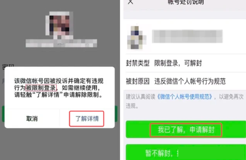 首先我们登入微信,这时它会出现一个提示框,我们点击了解详情。进入后它会有「我已了解,申请解封」、「暂不解封,提取账号内的财产」两个选项,这里我们点击第一个「我已了解,申请解封」,然后根据提示操作发送短信。
