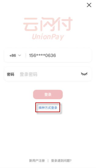 1、在云闪付登录界面,点击换种方式登录;