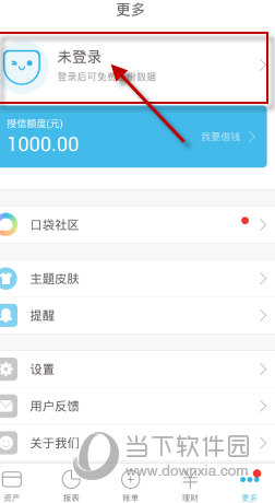 1、进入到口袋记账APP之后点击更多,然后点击未登录