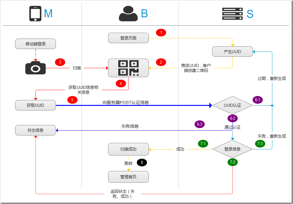 Step5,【M】向服务端发送UUID+登录信息,Step6【S】对UUID+登录信息进行相关解析认证,Step6 UUID认证,不通过认证,则到Step6-1 重新生成UUID循环Step 2与并Step6-2 返回给【M】UUID认证失败原因,Step6 通过认证,Step6-2转到登录信息认证,Step 7登录信息认证,失败Step7-3重新生成UUID循环Step 2,成功则Step7-1推送给【B】跳转到首页。