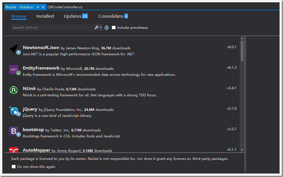 由于本人用的是VS15Preview4,可以直接使用Nuget可视化管理工具进行安装:Tools—>Nuget Package Manager—>Manage Nuget Packages for Solution…,打开以下界面: