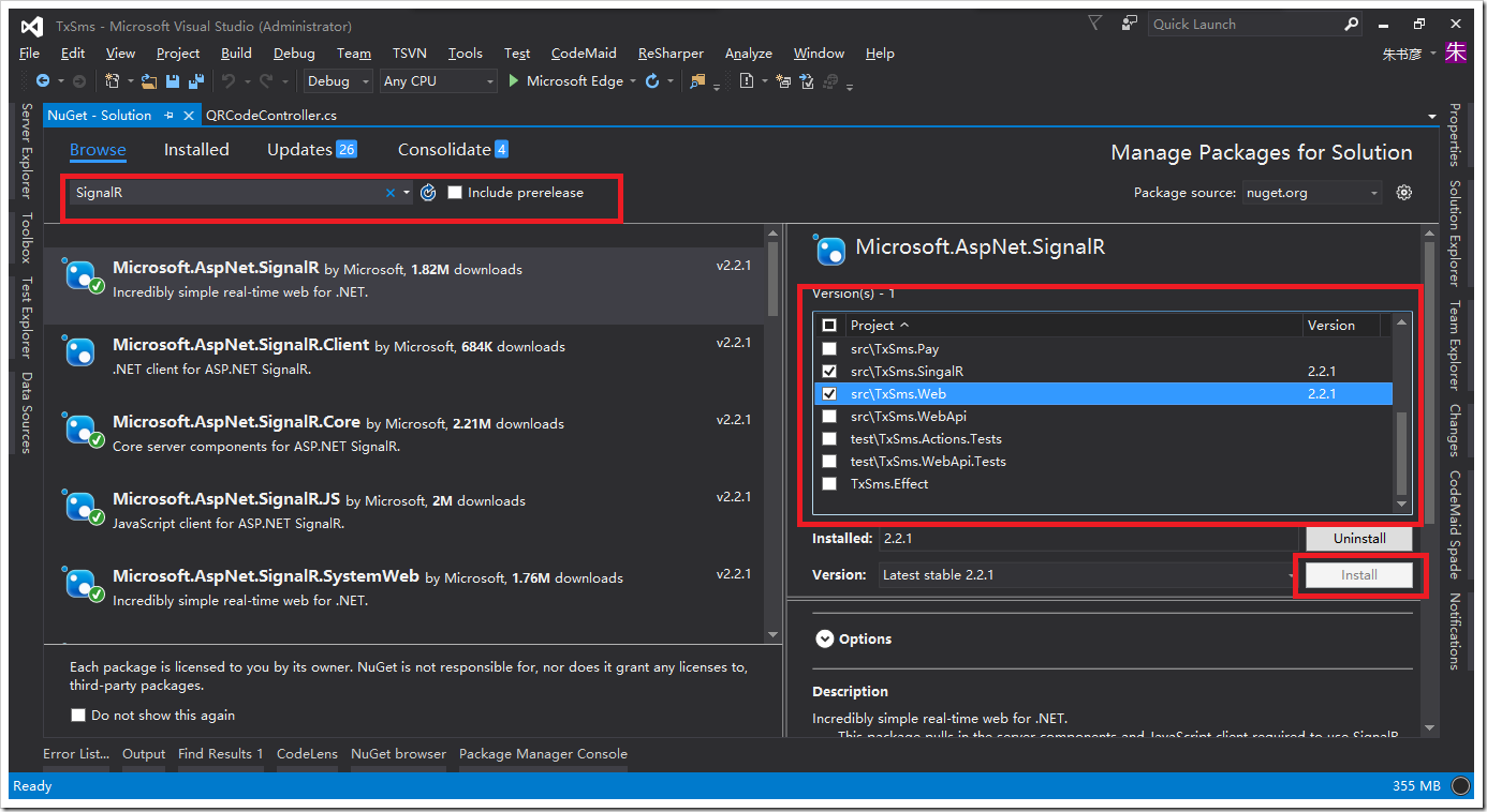 在Browser 标签下输入SignalR,查询到Microsoft.AspNet.SignalR