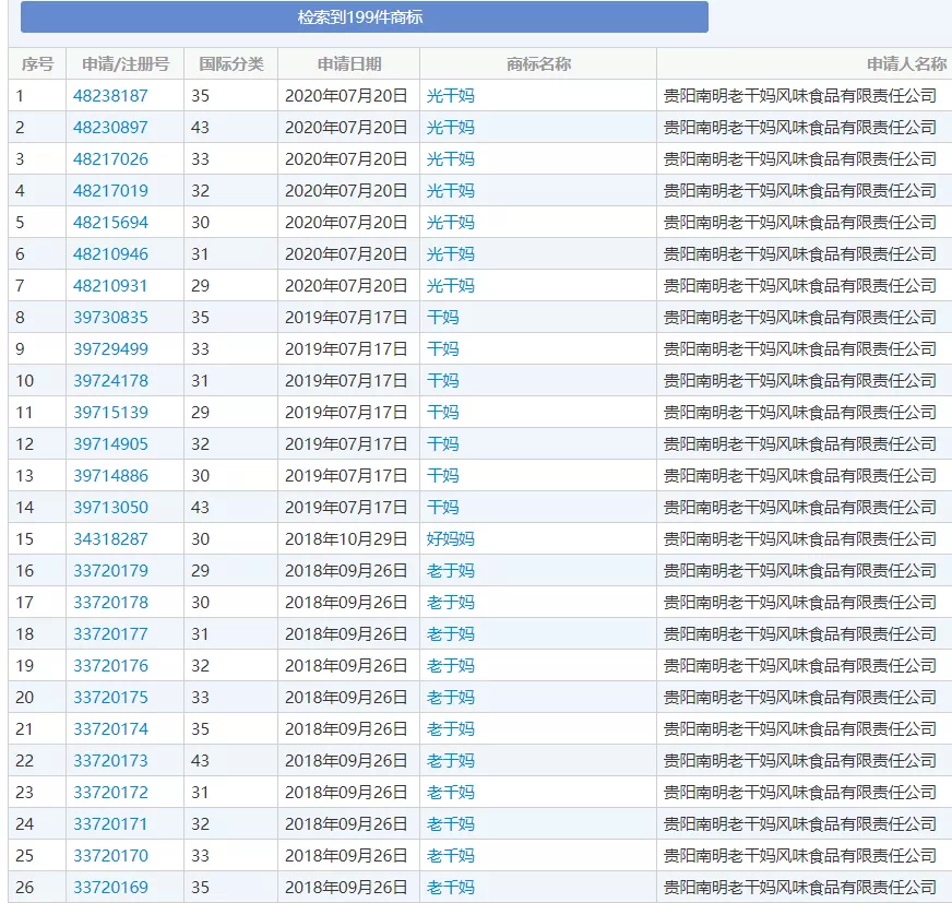 即便已经做到这样,仍然有不少其他公司也在抢注商标,看上去似乎是想尽力地靠拢“老干妈”这块招牌。