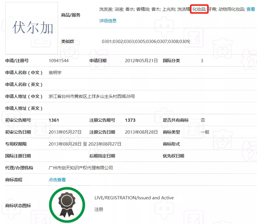 当敷尔佳面膜在电商逐渐升温,“伏尔加”作为“敷尔佳”的关联关键词,被蹭热度的第三方成功注册,且添加了3类化妆品,随后出现零售商大规模被投诉事件。
