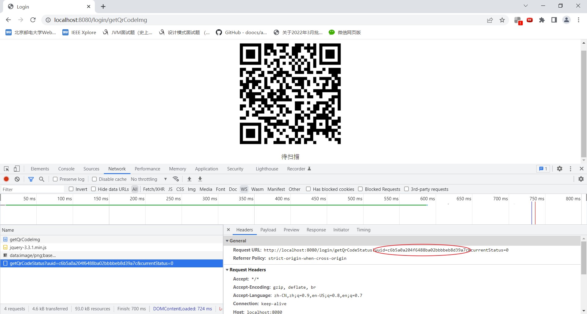 由上图我们得知,二维码中包含的其实是一个网址,手机扫描二维码后,会根据该网址向服务端发送请求。接着,我们打开 PC 端浏览器的开发者工具: