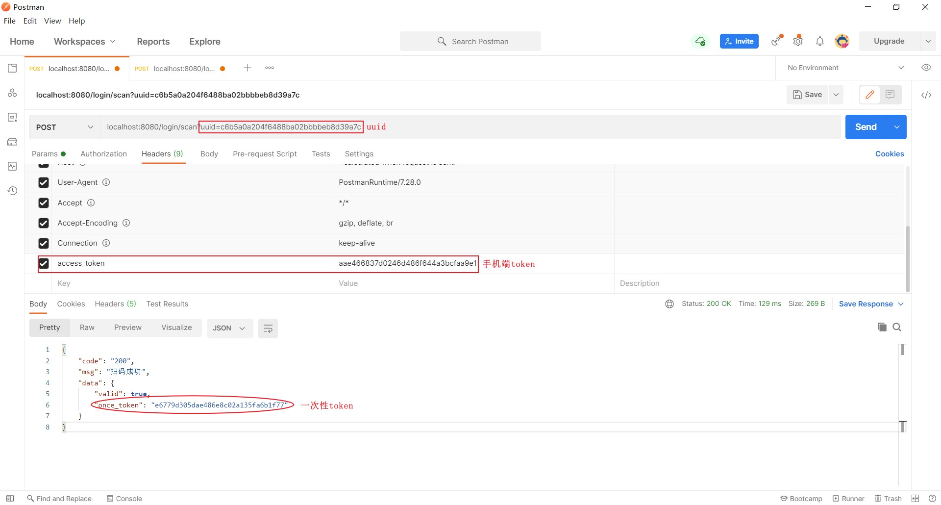 打开 Postman,发送 localhost:8080/login/scan 请求,Query 参数中携带 uuid,Header 中携带手机端 token:
