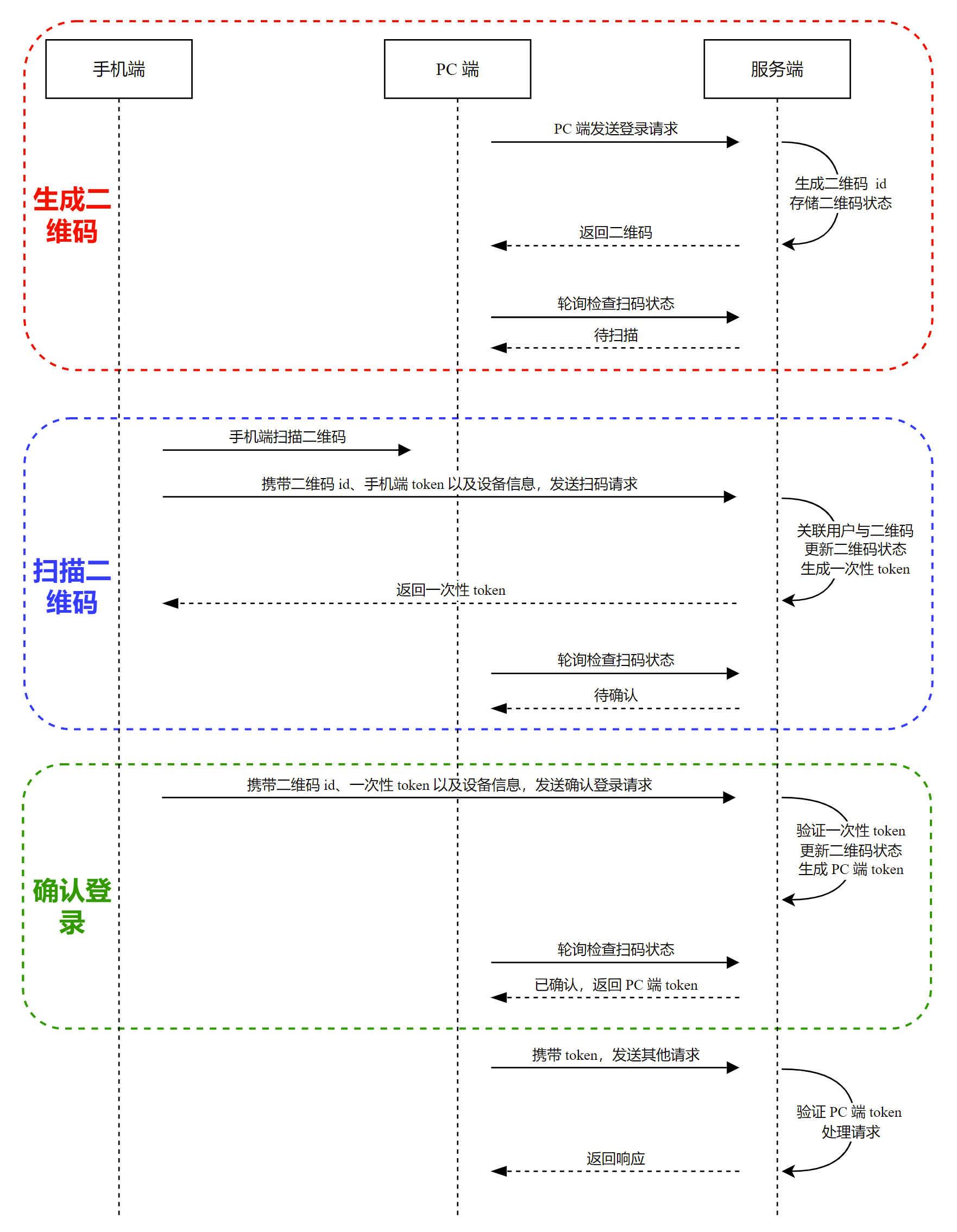 二维码最初为 "待扫描" 状态,手机端扫码后服务端将其状态改为 "待确认" 状态,此时 PC 端的轮询请求到达,服务端向其返回 "待确认" 的响应。手机端确认登录后,二维码变成 "已确认" 状态,服务端为 PC 端生成用于身份认证的 token,PC 端再次询问时,就可以得到这个 token。整个扫码登录的流程如下图所示:
