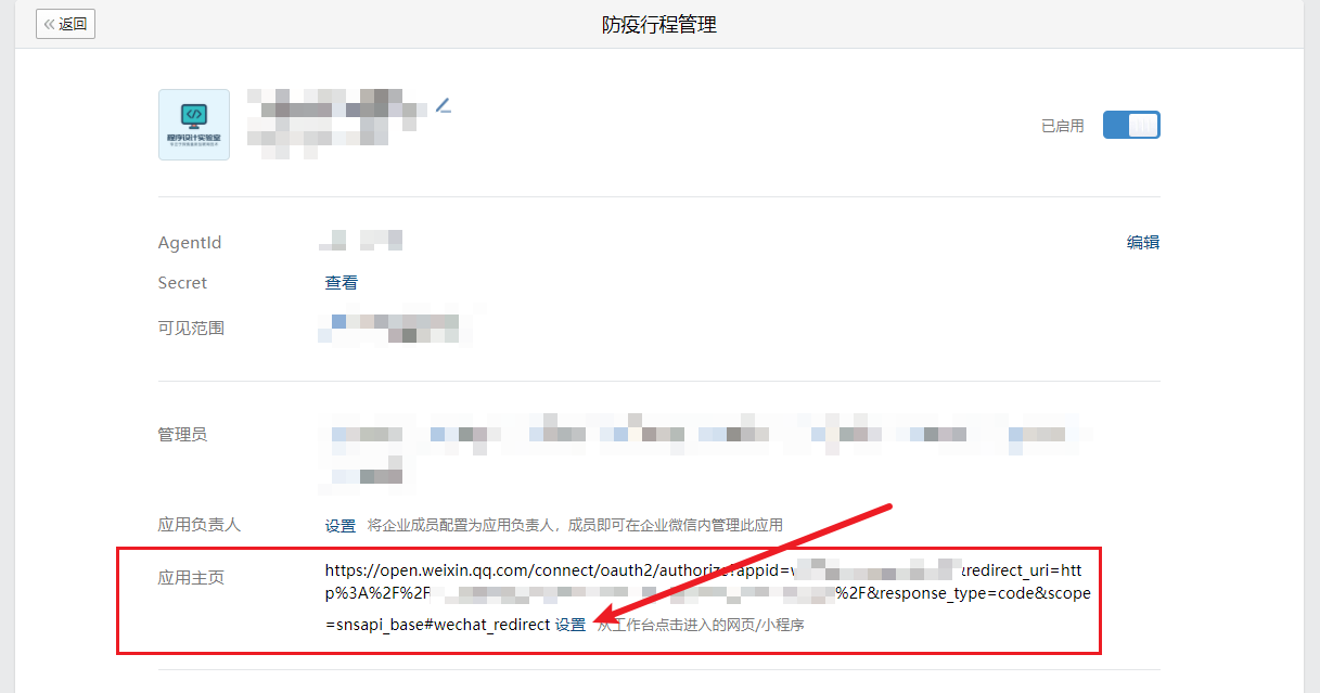 企业微信应用配置接下来我们把这个地址设置成企业微信应用的主页