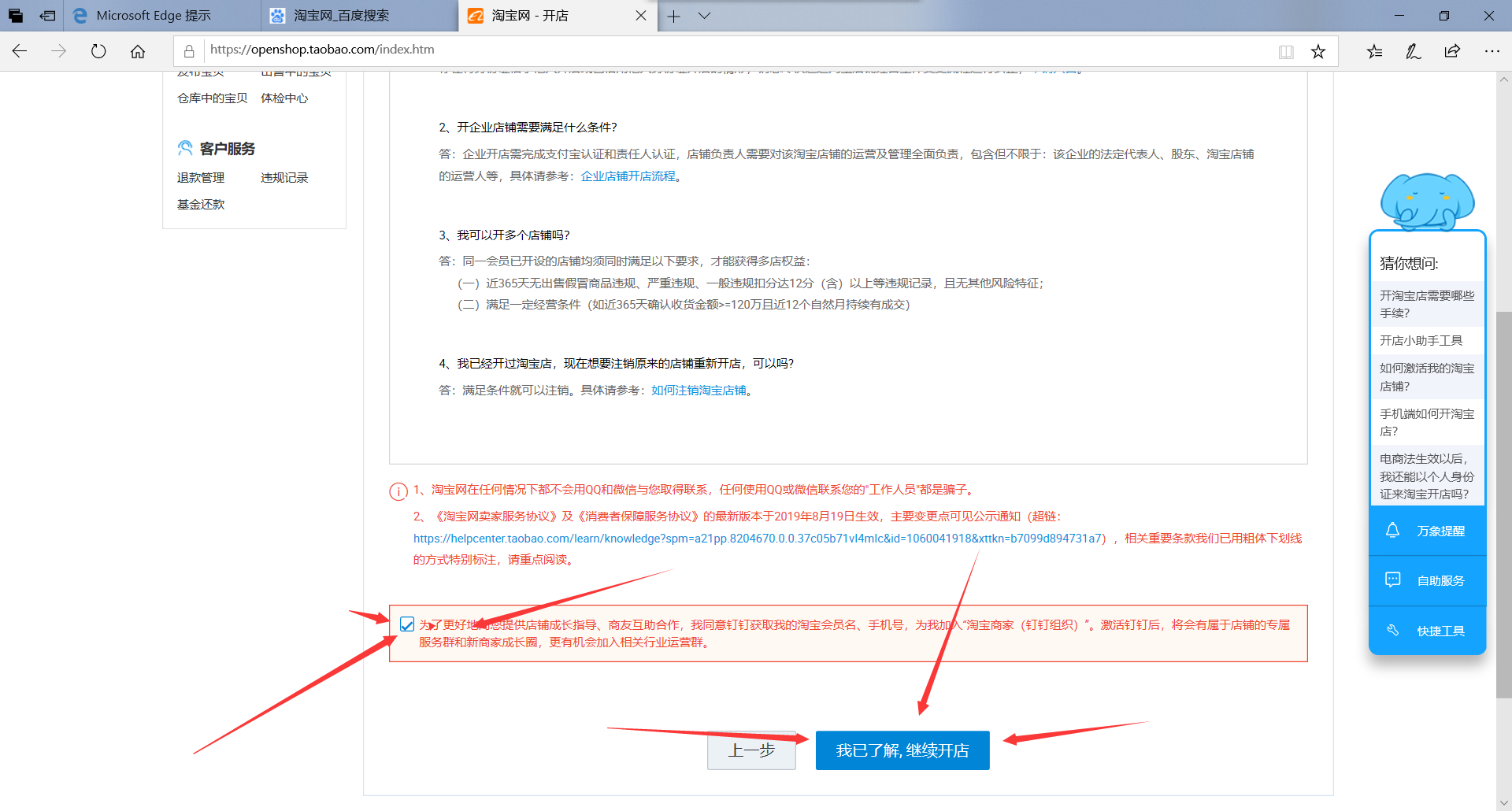 5、点击创建店铺完成以后会阅读开店须知,仔细看一遍就可以,看完之后在下面打钩,然后点击【我已了解,继续开店】。