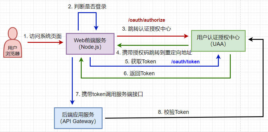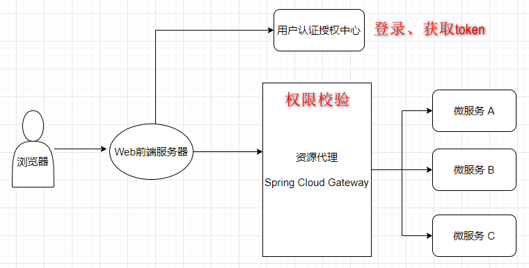 最开始是一个单体应用,所有功能模块都写在一个项目里,后来觉得项目越来越大,于是决定把一些功能拆分出去,形成一个一个独立的微服务,于是就有个问题了,登录、退出、权限控制这些东西怎么办呢?总不能每个服务都复制一套吧,最好的方式是将认证与鉴权也单独抽离出来作为公共的服务,业务系统只专心做业务接口开发即可,完全不用理会权限这些与之不相关的东西了。于是,便有了下面的架构图: