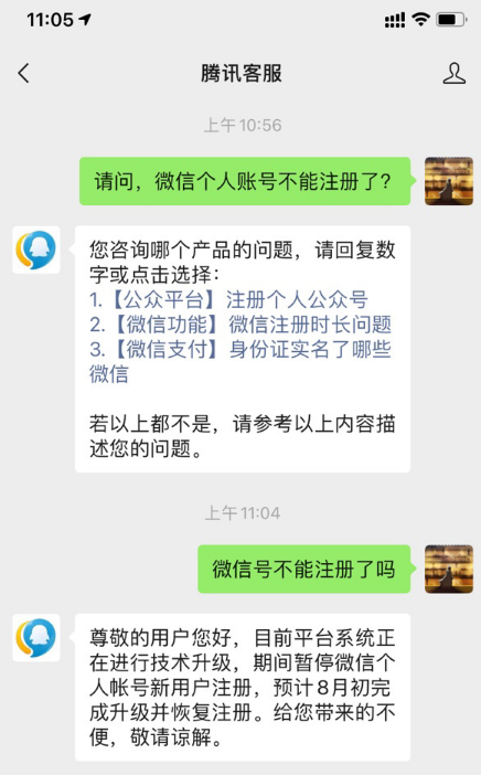 微信什么时候可以注册新账号微信个人账号的新用户注册入口已经关闭,无法注册新账户了。不过小编在腾讯客服咨询该问题时,发现腾讯已经为该问题设置了自动回复,其回应称:目前平台系统正在进行技术升级,期间暂停微信个人帐号新用户注册,预计 8 月初完成升级并恢复注册。
