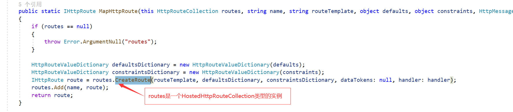 2.我们找到映射路由的扩展方法MapHttpRoute可以知道我们调用它的Route属性是一个HostedHttpRouteCollection也就是说,在MapHttpRoute中CreateRoute()是由HostedHttpRouteCollection来调用的