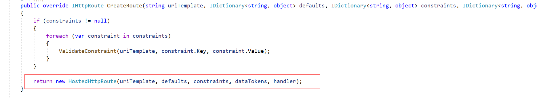 3.继续转到HostedHttpRouteCollection类中的CreateRoute()内部看到它返回一个HostedHttpRoute而它就是实现IHttpRoute的实例。