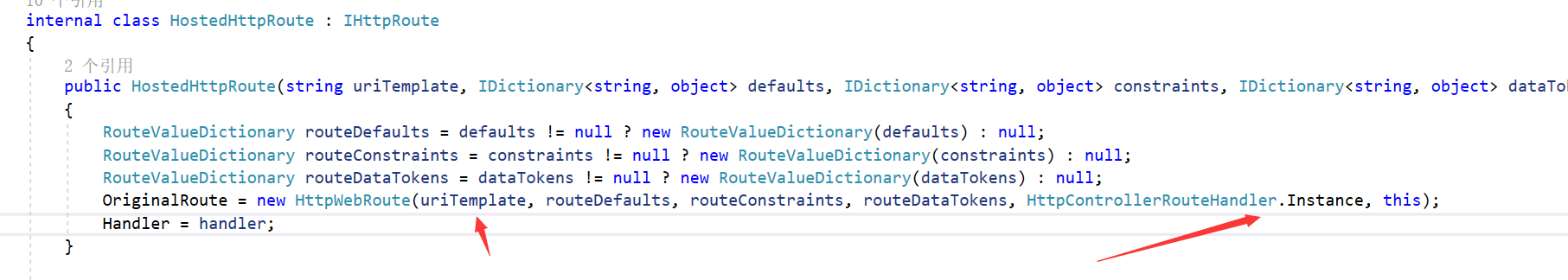 5.在HttpWebRoute初始构造时传入了几个极为重要的参数路由模板和IRouteHandler类型的HttpControllerRouteHandler以及一个IHttpRoute类型的HostedHttpRoute,然后程序返回,注意此处的IRouteHandler可以理解为是路由的处理器.最终在HostedHttpRouteCollection对象上调用routes.Add(name, route)添加 路由模板名字 和 处理程序.