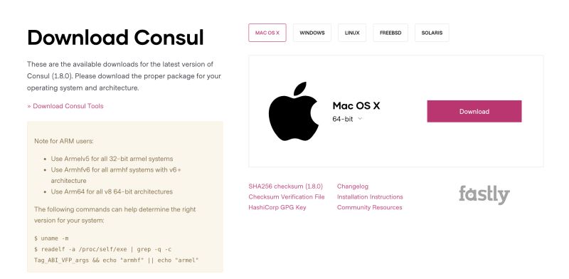 官网(consul.io)最新版本1.8.0 提供了MacOS,Windows, Linux, 如果你不知道怎么安装,官方还提供了视频。