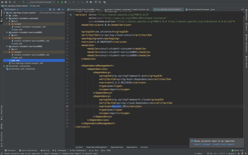 - 准备工作新建父工程, 主要约定SpringCloud, SpringBoot版本号,我使用的是Hoxton.SR1, SpringBoot2.2