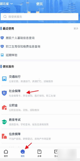 3、实名认证完毕后,找到下方的便民点击进入,找到便民服务,找到社会保障,点击进入