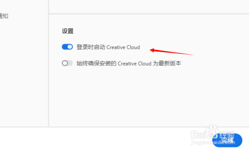 五、把登录时启动creative cloud选项打开后,点击箭头所指的完成选项。