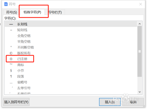 5、这时我们找到其中的“特殊字符”,然后点击其中的如下图所示的按钮即可插入已注册符号就可以啦