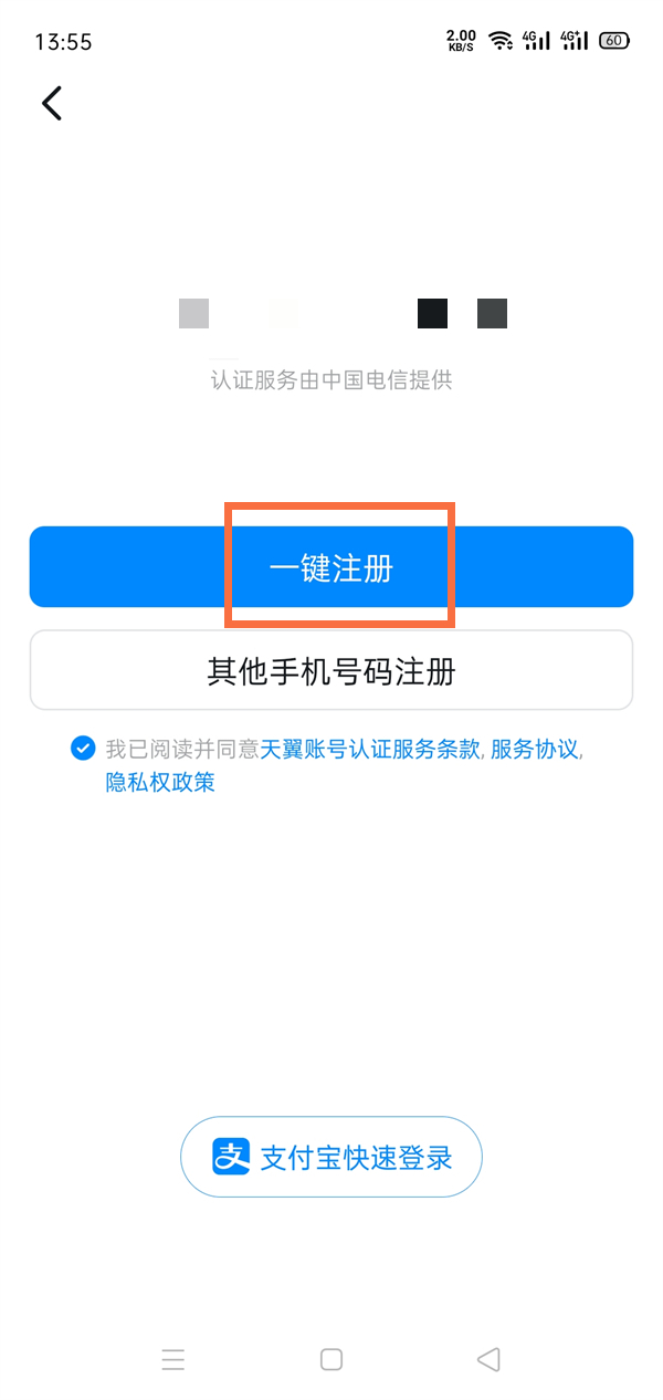 2、确认手机号码无误后,点击一键注册,或者点击下方的使用其他手机号码注册并输入号码。
