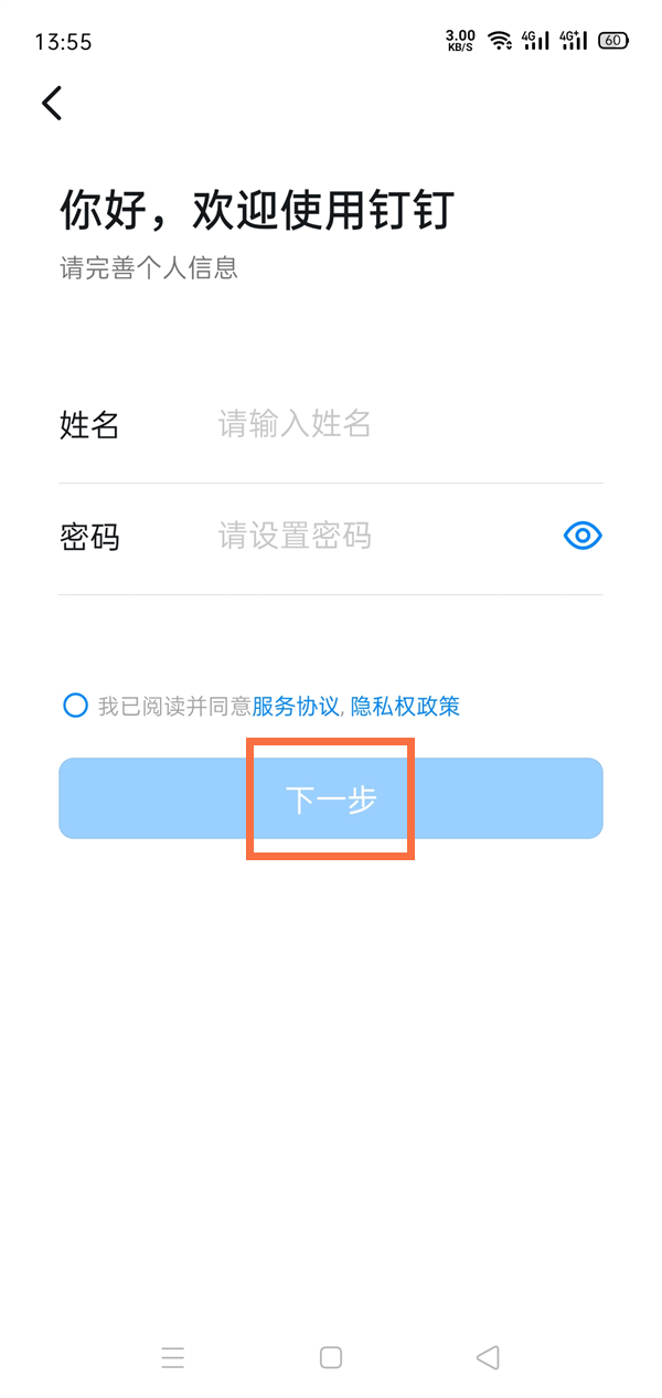 3、设置姓名和密码后,点击下一步。