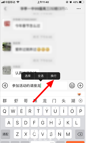 2.然后输入含有“报名”或“接龙”两字的一句话,点击输入框,跳出提示框,点击“换行”。