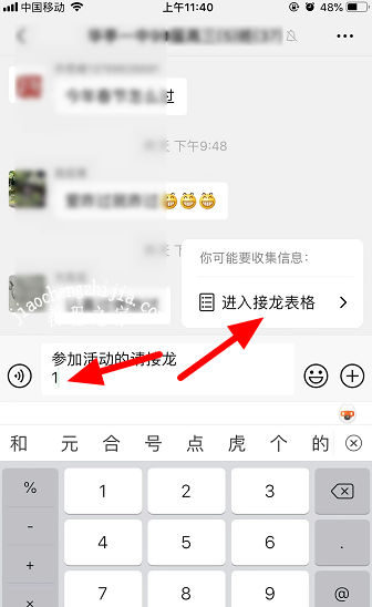 3.输入“1”,右侧会跳出提示框:“你可能要收集信息”,点击提示框中的“进入接龙表格”。