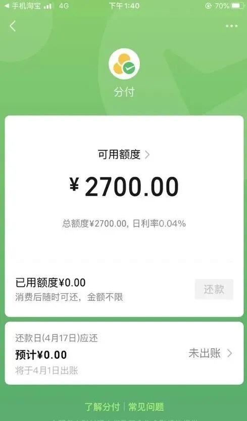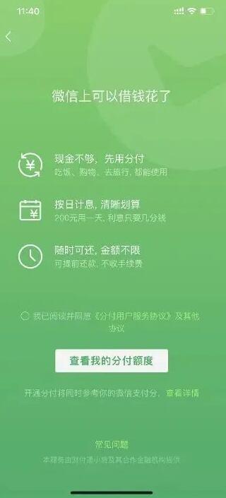 在利息方面,分付会按照用户实际使用天数计算,还款时支付累计的利息。还款后,本金减少,利息也减少。随借随还。根据微信方面的说明,200元用一天的话,每天利息只要几分钱,四舍五入简直不要钱了。
