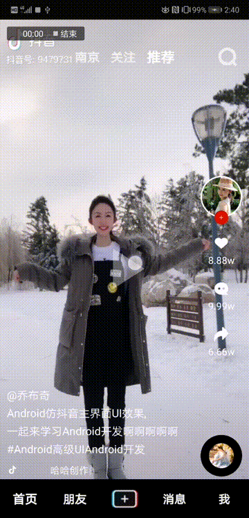 基础列表的承载控件我们已经选好了,然后通过上面的效果不难发现,每一屏里面实际上只有一个Item,所以基础的页面布局你应该也知道该怎么做了。然后就是视频播放了,由于这里我们只是仿照实现抖音的主页面效果,最核心的实际上是实现这个RecyclerView滑动的效果,所以代码我这里是尽量考虑简单化,因此视频播放就直接使用的Android原生的VideoView来做的,效果肯定不会多好,如果你对视频播放这块要求比较高的话,可以考虑使用基于ijkplayer实现的一些比较优秀的开源库,再或者能力强的自己基于ffmpeg定制开发播放器。