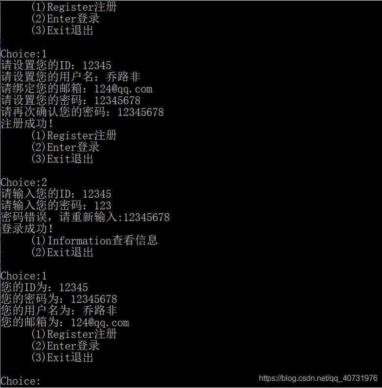 cout<<" (1)Register注册\n (2)Enter登录\n (3)Exit退出\n\nChoice:";