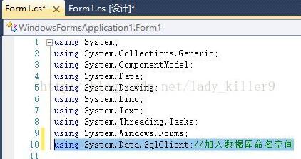 8.引入与数据库相关的命名空间(using System.Data.SqlClient;//加入数据库命名空间)