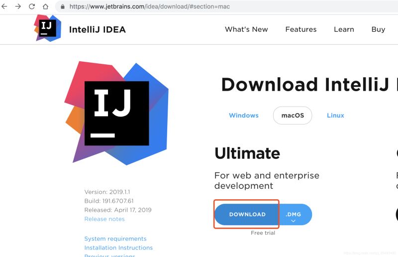 一、前往 jetbrains 官网下载 IDEA Ultimate版本 https://www.jetbrains.com/idea/download/#section=mac 点击“DOWNLOAD”按钮,直接进入 点击“direct link” 就直接下载ideaIU-2019.1.1.dmg文件了。 2.在Finder中显示